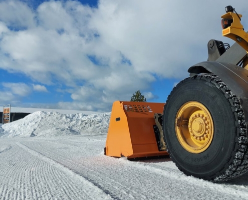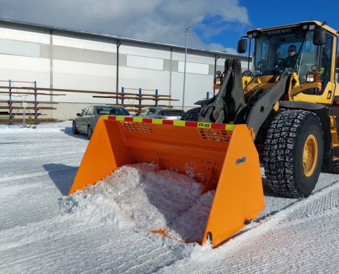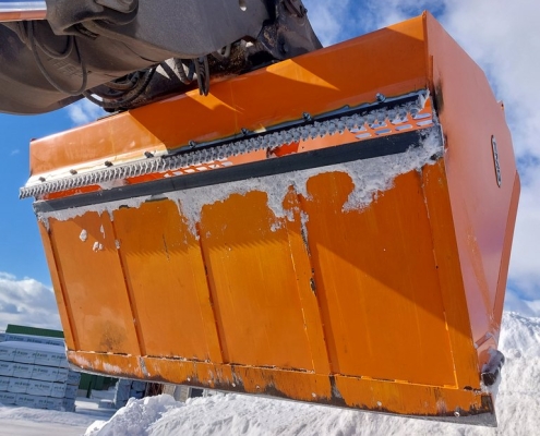 The ice-removing bucket is designed for ice removal in tight places. The blade at the bottom of the bucket cuts the ice and lifts it directly into the bucket so that the area will be cleaned with one equipment at once. And there is no need to remove the material separately with different equipment.