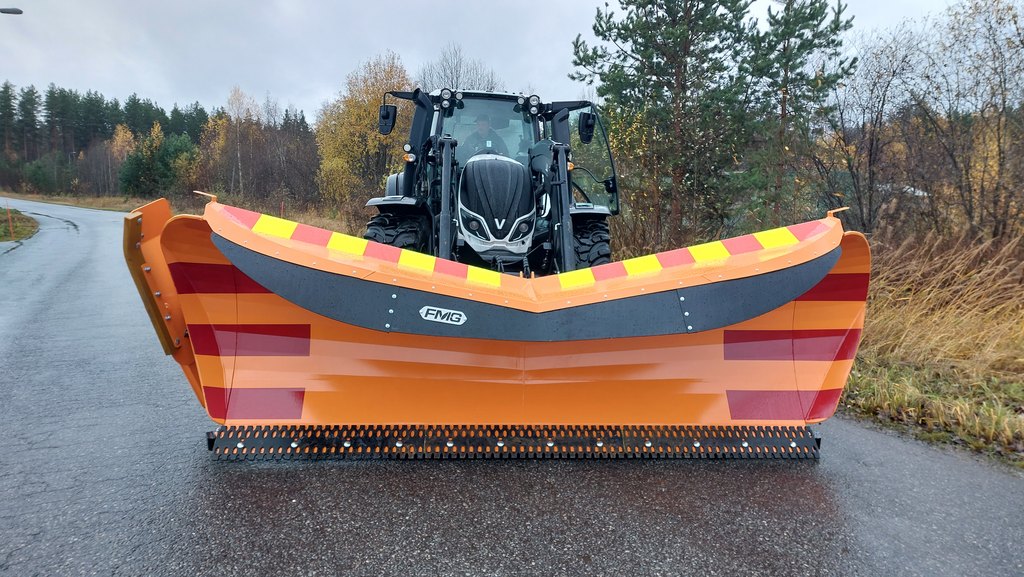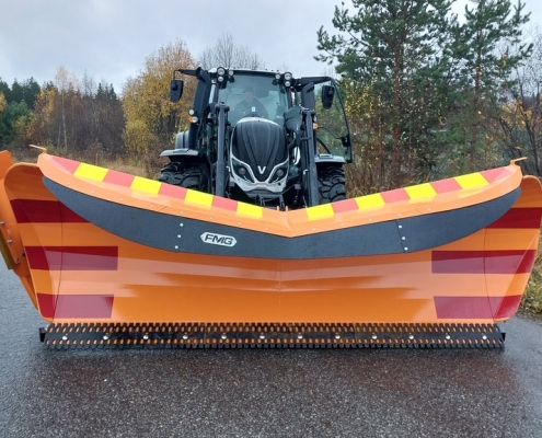 FMG plows are designed for professional use and built with a robust structure. The plow is turned using two hydraulic cylinders, allowing a turning angle of 41° to the left and 45° to the right. The blade angle relative to the road surface is 40°, ensuring efficient snow displacement.