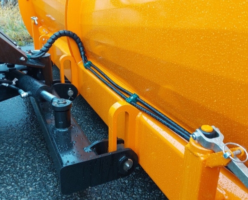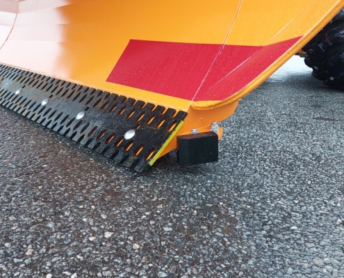 När vi diskuterat plog med kunder har det ökade behovet av ett hydrauliskt snöstopp uppstått. Av denna anledning inkluderade vi det också i utvecklingsprojektet för den nya plogen. Det nya snöstoppet inkluderar en kastarvinge, så dess påverkan på kastaregenskaperna är betydligt mindre än föregångarens. Geometrin har också omdesignats och stoppet döljs nu bakom vingen i uppfällt läge.